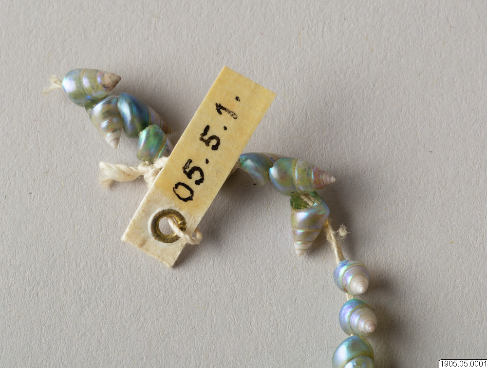 A necklace probably made of marinas (Phasianotrochus irisodontes), highly lustrous conical kelp shells of blue opalescent colouring. They are threaded onto cotton thread. The marinas or maireeners are collected from ribbon and bubble kelp at a few locations on the east and north coast of Lutruwita (Tasmania) and the Bass Strait islands.